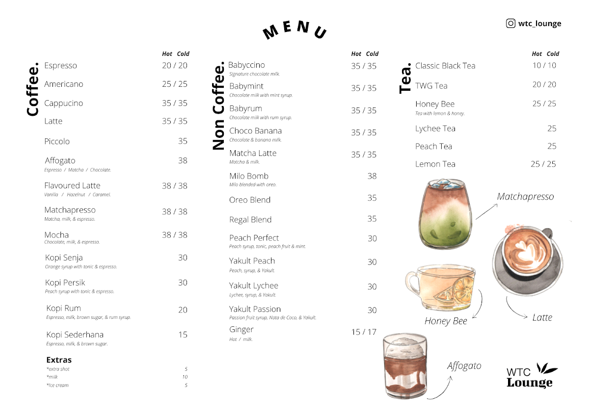 WTC Lounge boasts an extensive menu that highlights its well-crafted beverages. Enjoy a cup of Kopi Sederhana for just IDR 20,000, or indulge in a rich Latte or Cappuccino for IDR 35,000. For those seeking something different, their unique non-coffee options like Milo Bomb and Peach Perfect are worth a try.